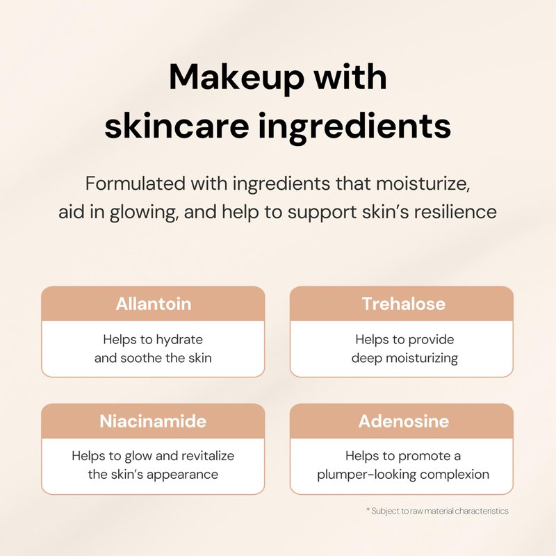 - SKINCARE-INFUSED MAKEUP: Enriched with Vitamin B3 (Niacinamide), Adenosine, Allantoin, and Trehalose to moisturize, brighten, and rejuvenate your skin.