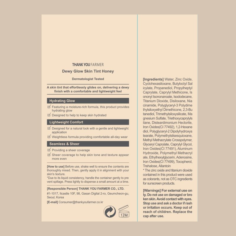 THANK YOU FARMER Dewy Glow Skin Tint, Long-Lasting Tinted Moisturizer, Light coverage, Vitamin B3, Niacinamide, Adenosine, Korean Beauty Makeup Dermatologist Tested, Honey, 1.75 fl oz