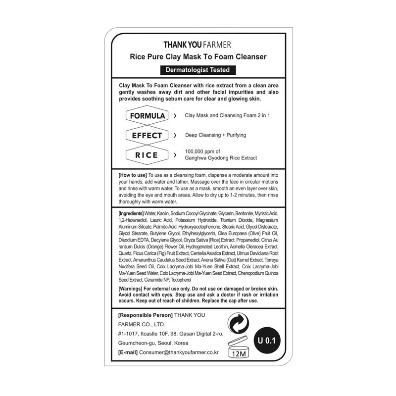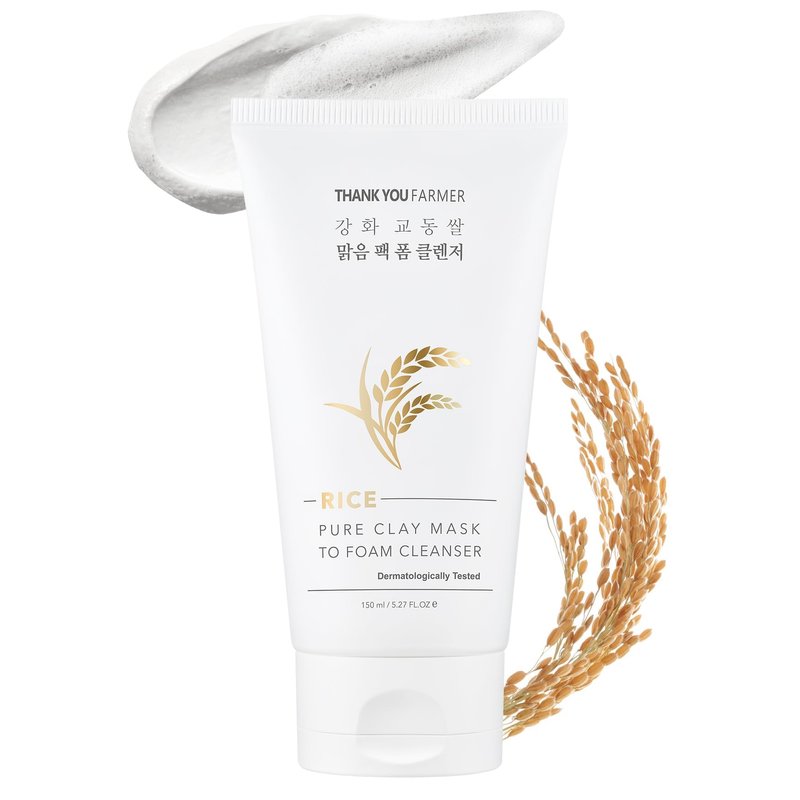 THANKYOU FARMER Rice Pure 2-IN-1 Korean Clay Mask to Foam Cleanser 5.27 fl.oz, Removes Excess Oil, Removing Dead Skin Cells, Soft Skin, Pore Purifying, Dermatologist Tested Korean Face Wash