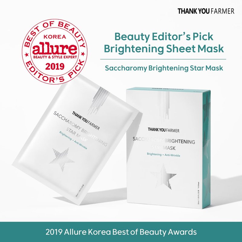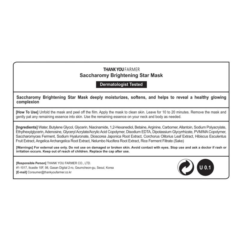 THANKYOU FARMER Saccharomy Brightening Star Mask (10ea) - Phyto Mucin Essence for Glowing, Niacinamide, Fermented Rice, Saccharomyces, Korean Sheet Mask for Dry and Dehydrated Skin (10)