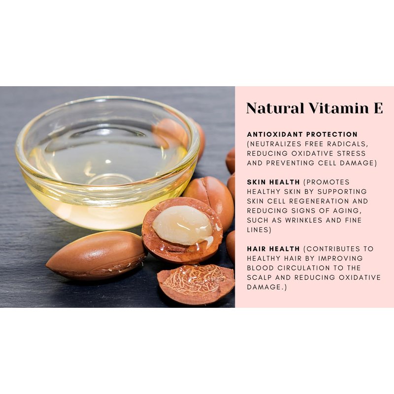 - Vitamin E: Antioxidant Protection (Neutralizes free radicals, reducing oxidative stress and preventing cell damage); Skin Health (Promotes healthy skin by supporting skin cell regeneration and reducing signs of aging, such as wrinkles and fine lines); Hair Health (Contributes to healthy hair by improving blood circulation to the scalp and reducing oxidative damage.)
