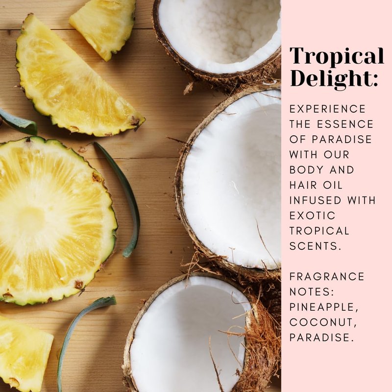 - Tropical Delight: Experience the essence of paradise with our body and hair oil infused with exotic tropical scents. Fragrance Notes: Pineapple, coconut, paradise.