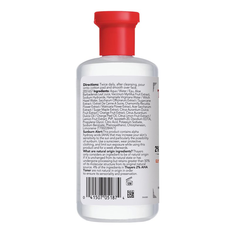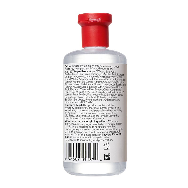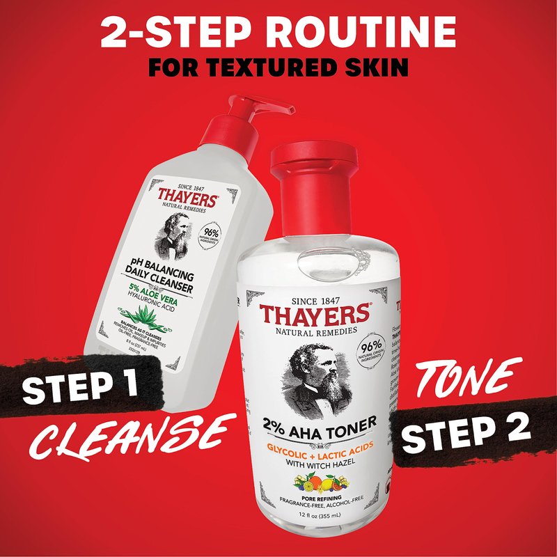 - Alcohol-Free AHA Thayers Facial Toner: Introducing Thayers 2% AHA Toner, a smoothing and pore refining toner featuring the finest natural ingredients. This toner exfoliates, smooths uneven skin and refines visible pores