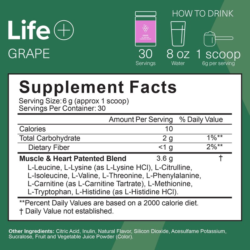 The Amino CO Life Essential Amino Acids Powder - EAA Supplement for Muscle Growth, Blood Pressure Support, Heart Health - Leucine and Citrulline for 40+ - Vegan, Non-GMO, Grape, 30 Servings
