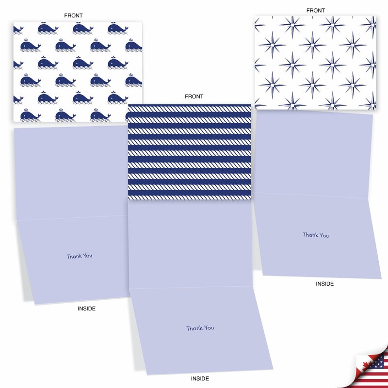 - MINI GREETING CARD SET - 4 x 5.12 Inch cards. Comes with 10 thank you cards and white envelopes. These cards showcase navy and white ocean-themed patterns. You’ll have plenty of writing room for personal sentiments. We offer a wide selection of designs and art styles, offering a unique match for men and women looking for the right note card for their special, personal message.