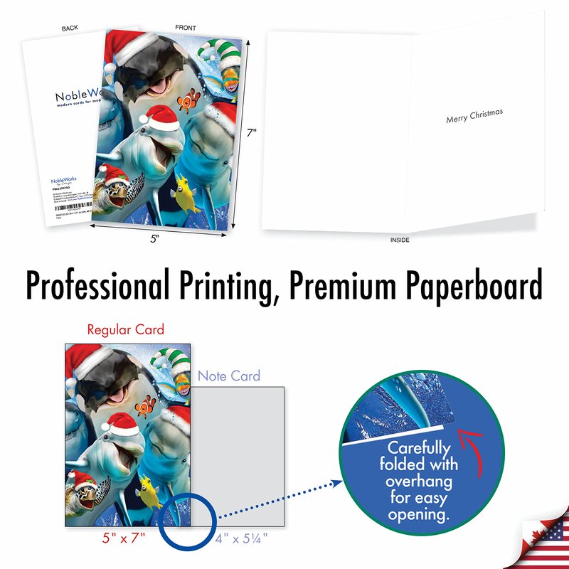 Divers and sea creatures loving friends and loved ones will surely love this unique, Merry Christmas greeting card! A beautiful greeting card that features 12 cards all with a fun and festive design. Embellished with dolphins, sharks and whales wearing Santa hat. This colorful card set is a great way to spread the wonderful Christmas vibe to everyone you love and care for. It is the perfect canvass for writing short but meaningful greeting messages to everyone! If you are looking for a Christmas card bundle that everyone will surely love, then is the one to buy! Regardless of age and gender, this card is a sure keeper! Any receiver will feel extra special and remembered when they get this gift card. Our good as gold cards are printed on thick, snow white cardstock. All happy holiday notecards are made of recycled material (no papyrus, naturally). Our print on demand technology further reduces paper waste and environmental impact. The high gloss cover photo pops with quality and color, while the inside is matte, creating a smooth writing surface for your heartfelt, joyful Christmas notes. This Christmas season, reach friends, family, and coworkers living near or far, as every greeting card ships with a mailing envelope. Bulk notecard assortments and sets arrive in a reusable box. All boxed notecard sets are easily stored in a work office desk, ready to customize for your next life occasion. Some card designs and photos even look great framed, creating appealing wall art for your home. This year, leave a big impression on your recipient, no matter the occasion. There are beautiful designs, and funny greetings, waiting for you! Many family friendly options, including cute and adorable art for kids, adorn our greeting card covers.
