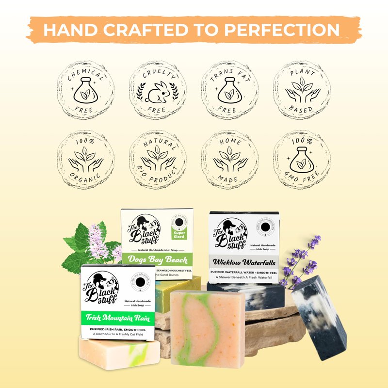 This set includes three distinct soaps: Wicklow Waterfall, Irish Rain Mountain, and Dogs Bay Beach. Each soap is carefully crafted using the cold process method, ensuring maximum preservation of the organic ingredients and essential oils.