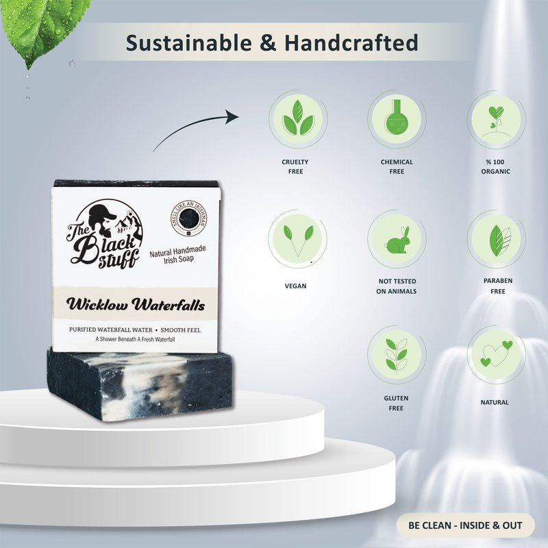 Experience the invigorating refreshment of The Black Stuff Wicklow Waterfall Soap, a premium men's bar soap crafted with organic ingredients and essential oils. This handmade, cold process body soap is meticulously designed to provide a moisturizing and cleansing experience, perfect for everyday use.