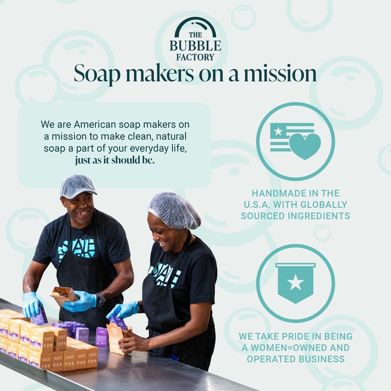 - THE BUBBLE FACTORY: From solo soap maker to dedicated team, The Bubble Factory is a Women-Owned and Operated business on a mission to make healthy, clean, natural soap a part of everyday life, just as it should be. Each handmade soap bar is curated with care in Arizona, USA, ensuring premium quality and supporting local jobs with simple ingredients, while preserving the cold-process method giving you that homemade soap feel