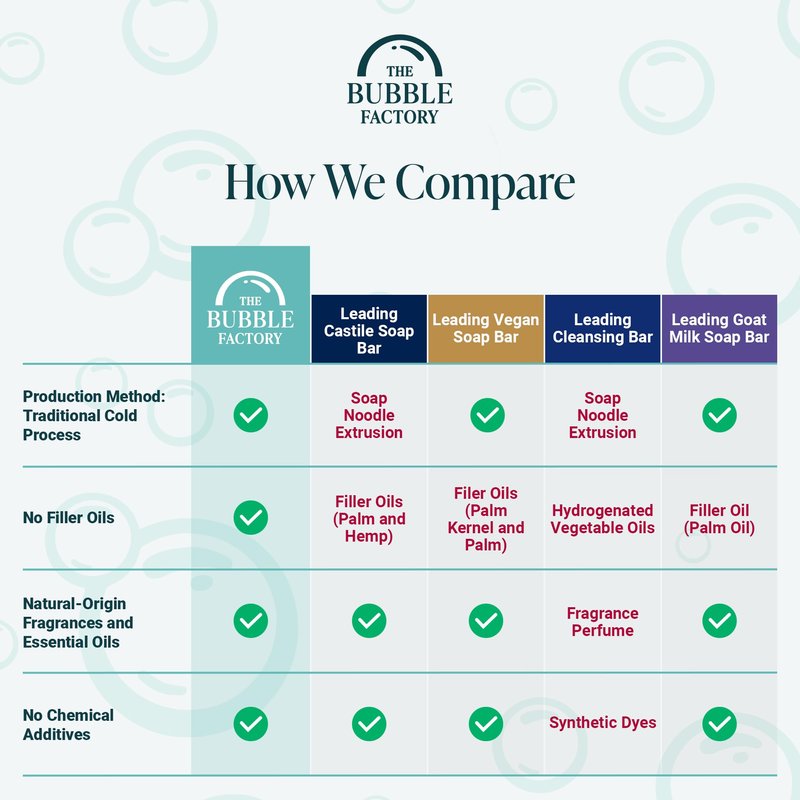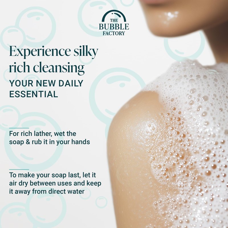 - PALM OIL FREE: The Bubble Factory bar soap is crafted in a Cosmetic GMP Certified facility with natural ingredients. Free from harsh chemicals like SLS, phthalates, and parabens. Palm oil free, vegan, cruelty-free, detergent free, chemical free, non-toxic, and gluten-free soap that is 97% naturally derived (even for the most sensitive of skin). Each moisturizing bar can last up to 4 weeks with proper drying care and moderate consistent daily use