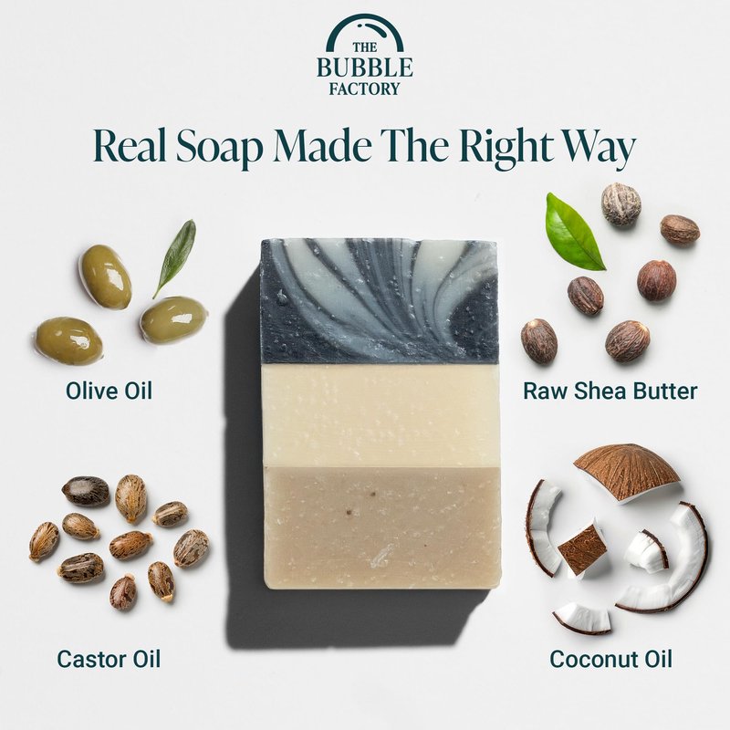 - THE COLD PROCESS DIFFERENCE: Traditional soap is made using the cold-process method, where fats and oils are used to create natural glycerin resulting in true soap (most commercial soaps on the shelves use synthetic ingredients that remove glycerin). The cold process allows all the natural soap goodness to stay intact and enhance our bars with their skin nourishing ingredients (Natural Glycerin, Raw Shea Butter, Natural Oils, Kaolin Clay)