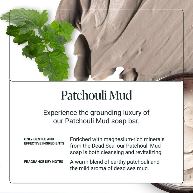 - PATCHOULI MUD SCENTED BAR SOAP: Spicy and woodsy Patchouli essential oil provides a musky, earthy spice and a hint of sweetness. Formulated with magnesium-rich Dead Sea mineral mud, this soap is both nourishing and revitalizing. Enjoy the natural goodness and retro vides of this bar while leaving your skin feeling soft and healthy