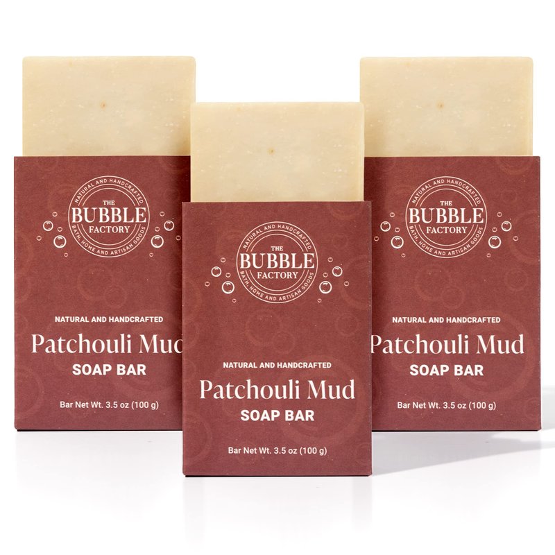 The Bubble Factory Handmade Natural Bath & Body Soap Bar, Vegan, All-Natural, Palm Oil Free, Made in USA with Shea Butter + Essential Oils, Patchouli Mud, 3 Bars