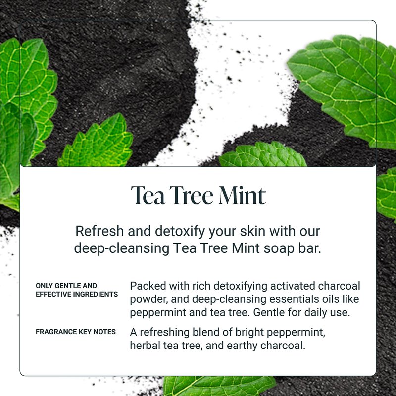 - TEA TREE MINT SCENTED BAR SOAP: Refresh and detoxify your skin with our deep-cleansing Tea Tree Mint soap bar. A clean and refreshing blend of bright peppermint, herbal tea tree, and earthy charcaol. Our Tea Tree Mint soap bar is packed with rich detoxifying activated charcoal powder, and deep-cleansing essentials oils like peppermint and tea tree. Gentle enough for daily use.