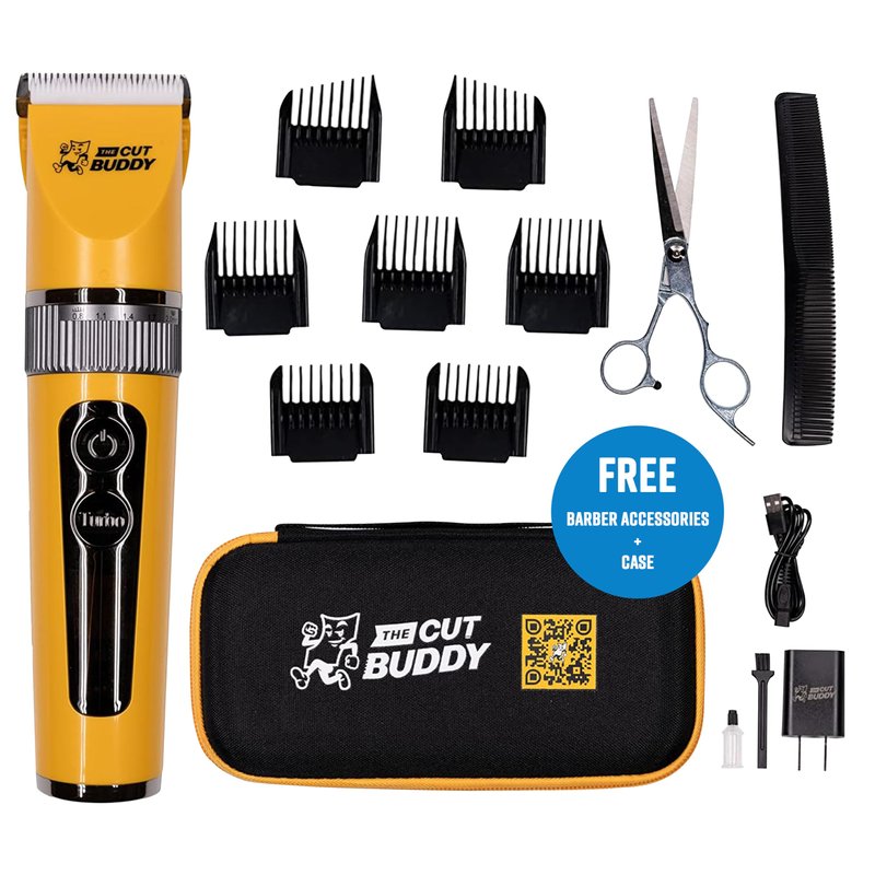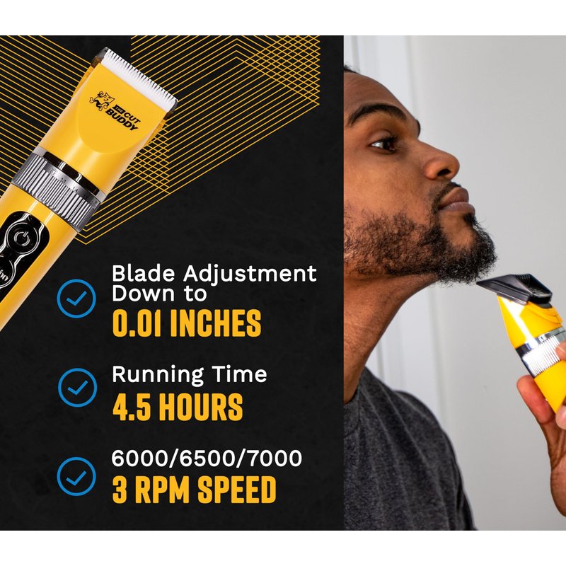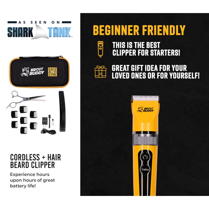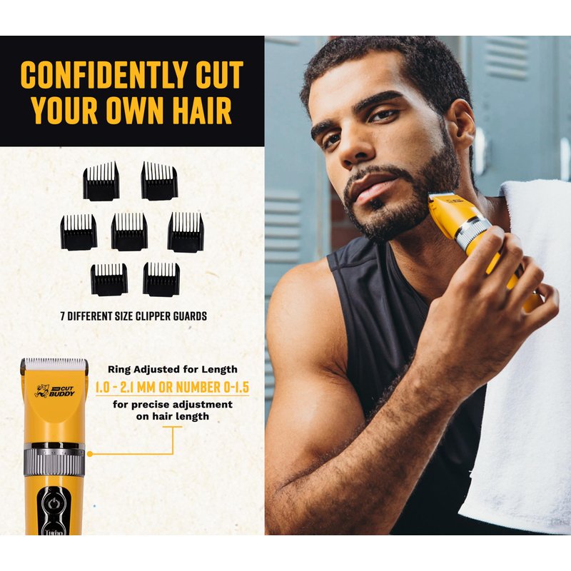 The BEST Clipper for starters! The Cut Buddy Beginners Hair Clipper is specifically designed for beginners who want to achieve a smooth cut and/or fade on their head or facial hair at home. This is the perfect clipper if you have just started cutting your own hair, or if you are a parent cutting your children’s hair. This easy-use-clipper is cordless and works great for hair, beards, other facial hair, and body parts. The Titanium plated blade with ceramics ensures the clipper does not get hot, stays quiet, and never gets dull. The adjustable blade can go down to 0.01 inches with an adjustable ring for lower cuts or smooth fading. Experience 270 minutes of battery life! The precise digital display of percent battery, burden status, and inductive charging will keep the guesswork out and you’ll always know when you need to plug it in. Also has a locking feature to prevent accidental start during travel and storge. It is even easy to clean, just pop the blade out and brush. You’ll feel confident cutting your own hair with all the necessary tools in this kit, which includes a travel case, USB charger, comb, barber grade scissors, cleaning brush, 7 guard combs, lubricant, and a protective cap.