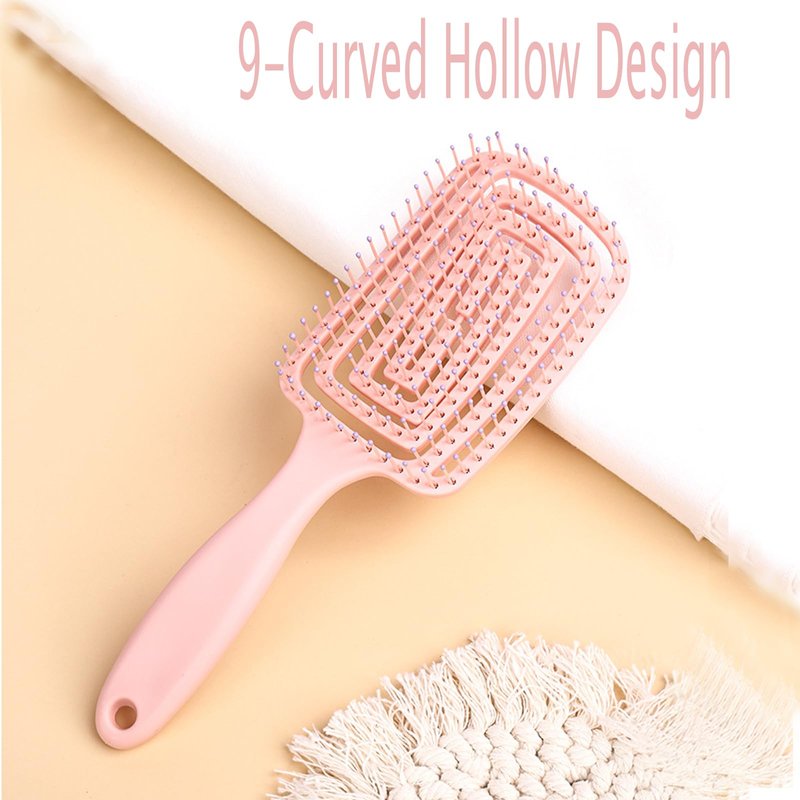 - 1.No Pull- Detangling Brush: Compared with traditional combs, our hair brush has a widened tooth surface and a 9-curved hollow design, which can be bent to gently separate the hair and easily remove knots without breakage. And the wet hair brush allows your hair to disperse your scalp's own natural oils more quickly, to make your hair in a silky, shiny and healthy-looking status.