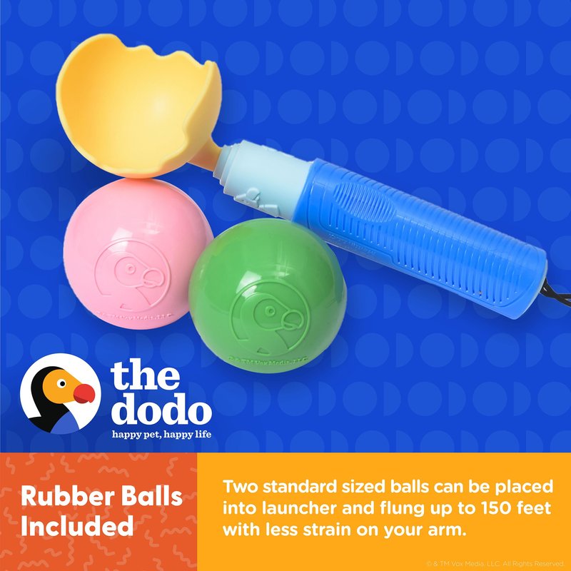 The Dodo Telescoping Ball Launcher Dog Toy with 2 Rubber Balls; Collapsible Fetching Dog Ball Toy, 9in Total Length; Dog Ball Thrower in Blue and Yellow, Portable
