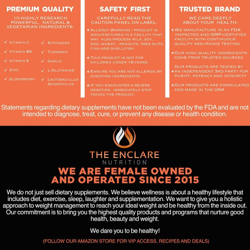 IMMUNE BOOSTER - HERBAL IMMUNE SUPPORT SUPPLEMENT FOR WOMEN AND MEN NATURALLY POWER YOUR IMMUNE SYSTEM DEFENSES: 10-in-1 Emergency Immune System Support Supplement - One Capsule - Multiple Benefits. A strong immune system helps you guard against everyday stresses. Take our Immune Support vitamins daily to supercharge your immune system and as an emergency immune support supplement when not well for immune system support boost. * These vegetarian immunity vitamins are Non-GMO and Made in the USA. Power Immunity provides you and your whole family with optimal daily multi-organ support. Our immune defense pills combine the comprehensive power of Vitamin C, Zinc capsules, Vitamin E, Vitamin B6, Elderberry capsules, Echinacea capsules, Turmeric supplement capsules, L Glutamine capsules, Garlic supplements and Probiotic capsules. 10 powerful immunity boosting ingredients that boost immune system, help lessen seasonal doldrums and support digestion. These natural immune support ingredients all help different parts of your body work better. Some are protectors, some are builders, and some keep everything running smoothly. With the added benefits of nutritious essential vitamins, they support your body’s natural defenses, helping you stay healthy and feel your best. Enclare Power Immunity Immune Support Supplement ingredients are: 1. Sambucus Elderberry supplement 2. Echinacea 3. Zinc supplements 4. Vitamin B6 5. Vitamin C V 6. Vitamin E 7. Turmeric Curcumin 8. Garlic 9. Lactobacillus Acidophilus 10. L-Glutamine Enjoy the power of 10 high quality and potent immunity booster vitamin supplements in one capsule, giving you the immunity support you need all year-round.*