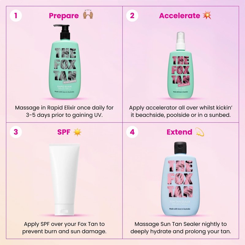 - HOW TO USE: Apply The Fox Tan Rapid Elixir to your body every day, 3-5 days before sun or sunbed exposure. Continue to use daily during periods of consistent sunshine. For best results, use in conjunction with any of The Fox Tan Accelerator range.