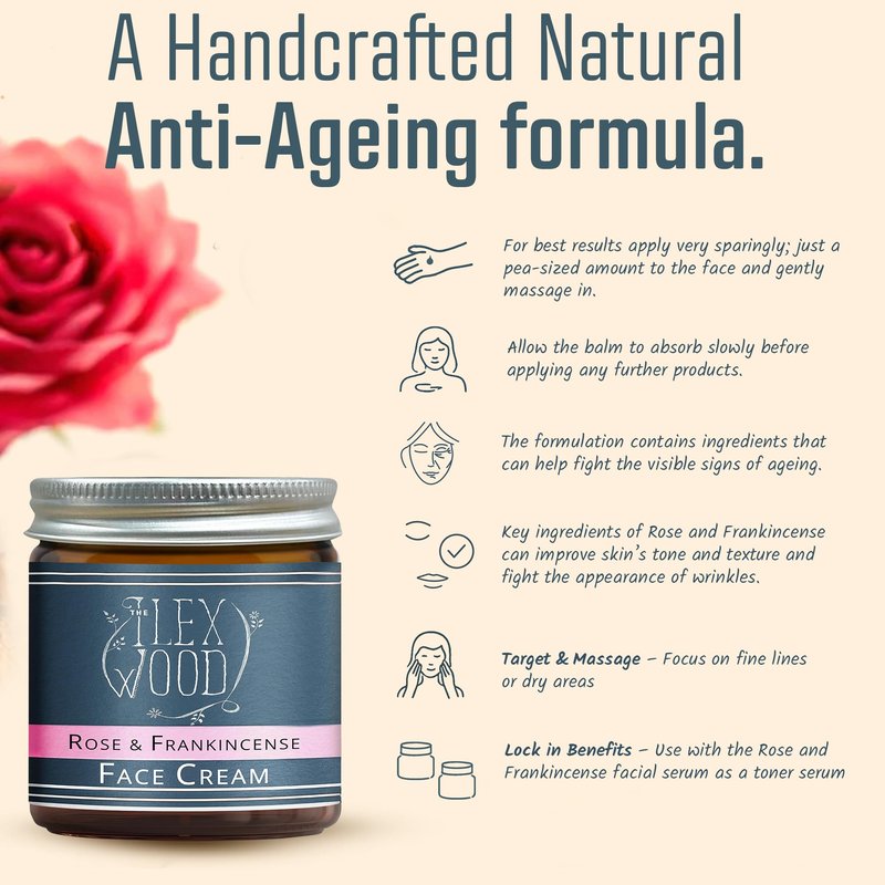 The Ilex Wood - Rose and Frankincense Face Cream - 100% Natural, Vegan, Moisturising, Anti Ageing, Wrinkle and Line Reducing Ingredients - 60ml (2.03 fl oz)