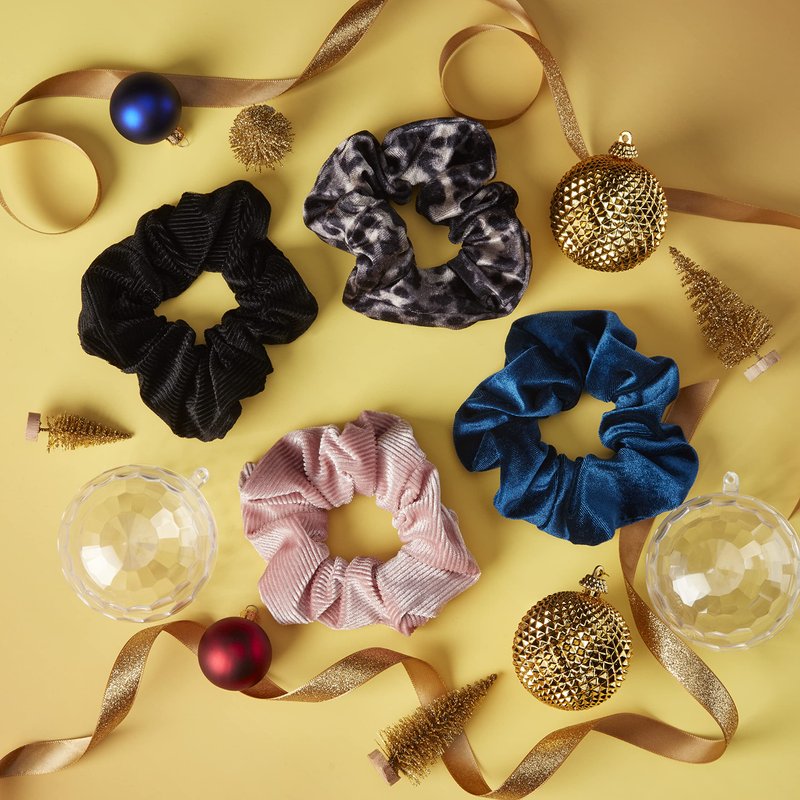 - 4 scrunchies in varied styles, including leopard print velvet, black ribbed velvet, pink ribbed velvet, and teal velvet