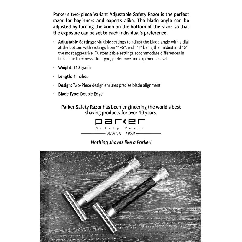 The Parker Variant Adjustable is a precision tool that will serve you well for many years. It is the perfect razor for beginners and experts alike. The blade angle can be adjusted by turning the knob on the bottom of the razor, so that the exposure can be set to each individual's preference. This beautifully designed graphite and satin chrome plated all brass frame is a heavyweight, smooth shaver. Parker Safety Razor has been making the highest quality, precision engineered safety razors for over 45 years. Adjustable Settings: Multiple settings to adjust the blade angle with a dial at the bottom with settings from "1-5", with "1" being the mildest and "5" the most aggressive. Customizable settings accommodate differences in facial hair thickness, skin type, preference and experience level. Razor type: Two Piece Adjustable Safety Razor Weight: 4 oz./110g Length: 4 in. Design: Two-Piece Design ensures precise blade alignment Blade Type: Double Edge Handle material: Genuine brass frame, electroplated finish in satin chrome and graphite color.
