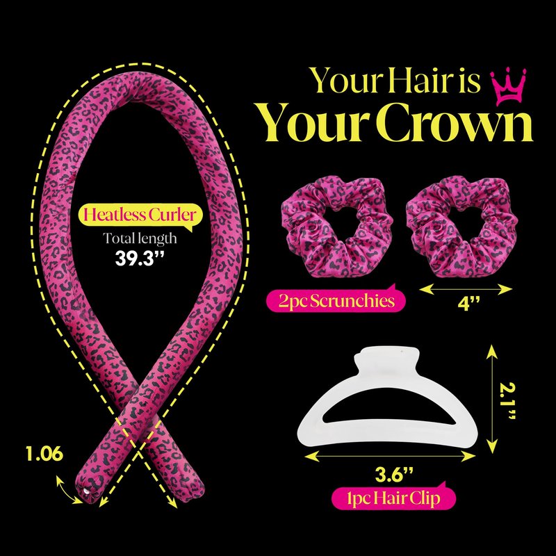 The Queen Curl Satin Headband for Heatless Overnight Curls & Frizz-Free Waves on All Hair Types | Sleep-In Hair Curlers with Hair Clip & Scrunchies (Pink Leopard)