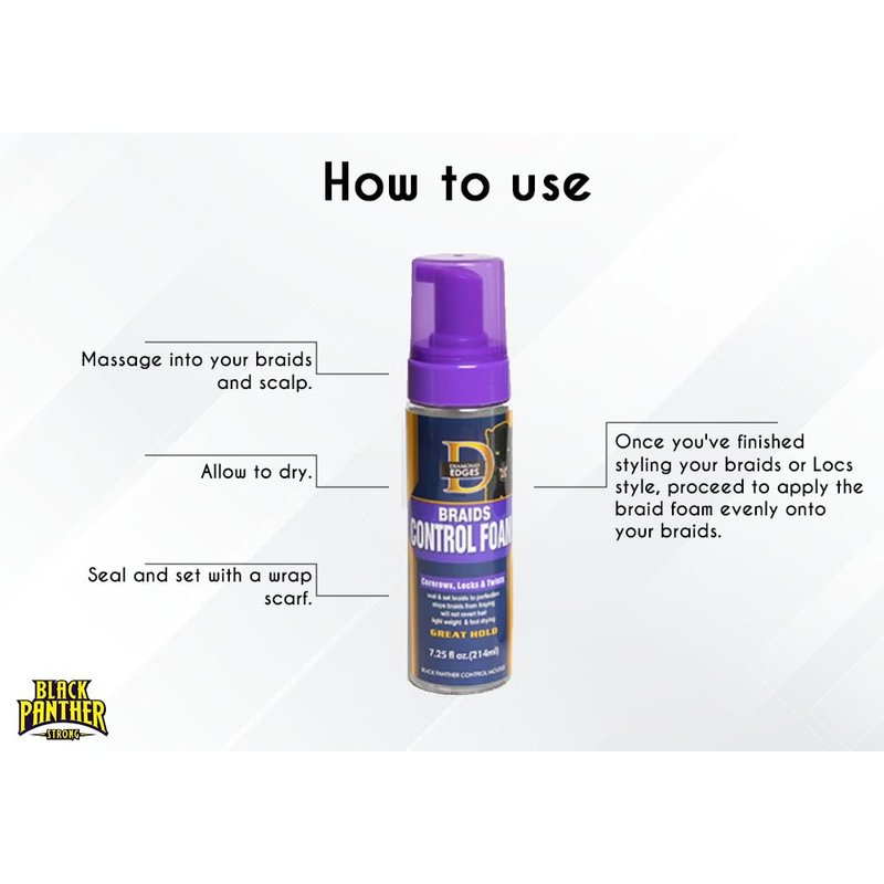 - Control flyaways and frizz with Our Braid kit combo. Lightweight formulation makes our foam easy to spread, as it reduces frizzing, prevents flyaway’s, locks in moisture, and dries quickly. Plus Our Black Panther Strong pomade provides a Fierce Hold – The frustration of products that flake, dry out, or weigh you down is over thanks to Black Panther Strong edge booster gel. Experience a frizz-free look that stays and slays all day.