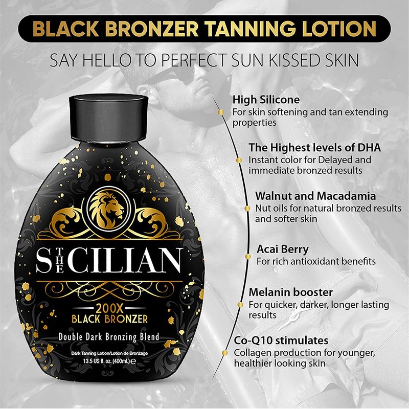 - [Premium Value] – Get the most out of your favorite tanning lotion & never worry about running out when you need it most! One bottle of The Sicilian 200X Black Bronzer packs a powerful 13.5 oz. of premium ingredients to keep you tanner, longer.