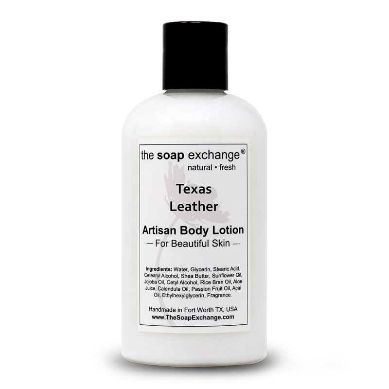The Soap Exchange Body Lotion - Texas Leather Scent - Hand Crafted 8 fl oz / 240 ml Natural Artisan Skin Care for Hand, Face, & Body, Moisturize, Hydrate, & Protect. Made in the USA.