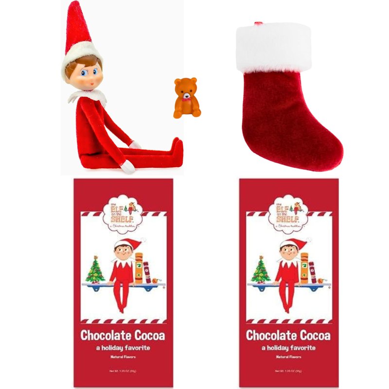 The World's Smallest Elf on The Shelf Boy with Matching Small Christmas Stocking and Two Elf on The Shelf Hot Chocolate Cocoa Mix Packs