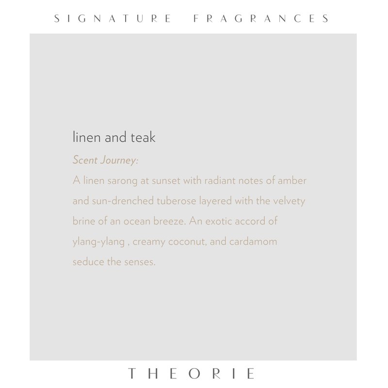- 𝐋𝐔𝐗𝐔𝐑𝐈𝐎𝐔𝐒 𝐒𝐂𝐄𝐍𝐓: Inspired by fine fragrance, Linen and Teak conjures a linen sarong at sunset with radiant notes of amber and sun-drenched tuberose layered with the velvety brine of an ocean breeze. An exotic accord of ylang-ylang, creamy coconut, and cardamom seduce the senses.