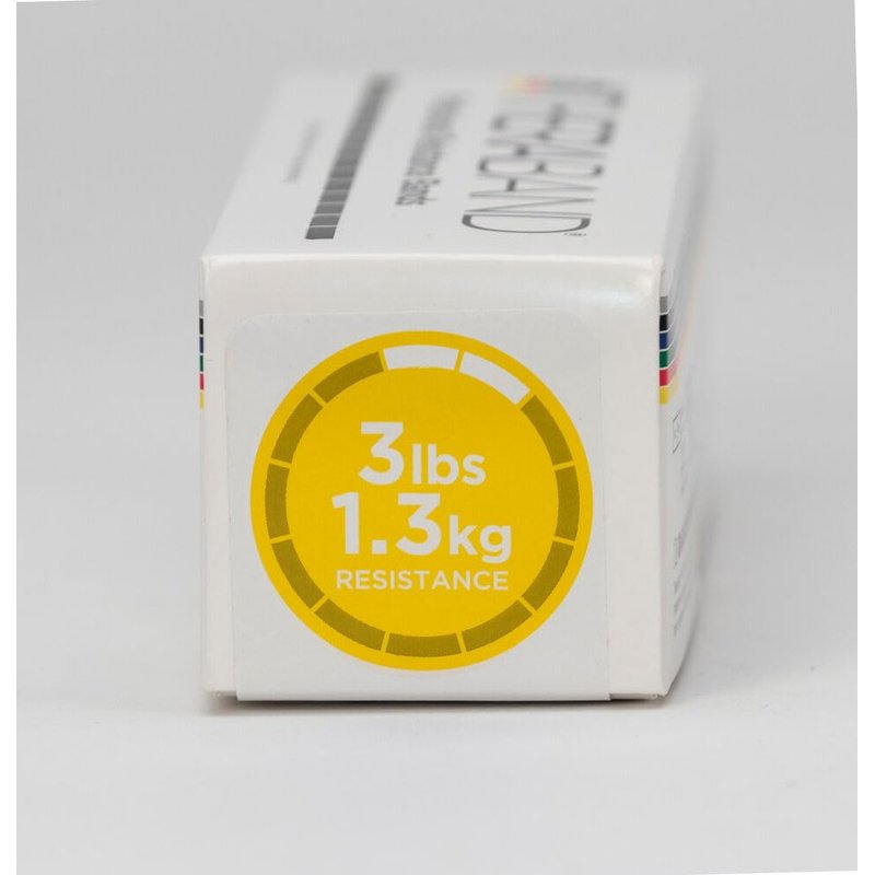 - Thin Yellow Bands are the 2nd of 8 resistance levels, perfect for rehabilitation or beginners. They offer 3.0 lbs. resistance at 100% elongation, a 25% increase from the previous color, and 4.3 lbs. at 200%. The roll measures 6 yards long x 5" wide