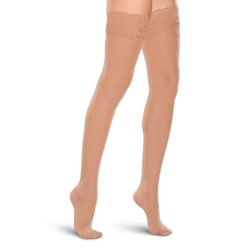 Therafirm Women's Lace-Top Thigh High Stockings - 20-30mmHg Moderate Compression Nylons (Sand, Small)