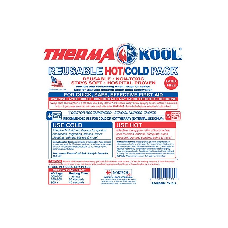 Therma-Kool is a reusable gel pack designed to provide comfortable pain relief when cold or hot therapy is required. Therma-Kool remains flexible when frozen and is safe for microwavable use. Use cold for the treatment of sprains, strains, headaches, contusions, bruises, minor bleeding/burns. Use hot for temporary relief of muscle stiffness, aches and pains.