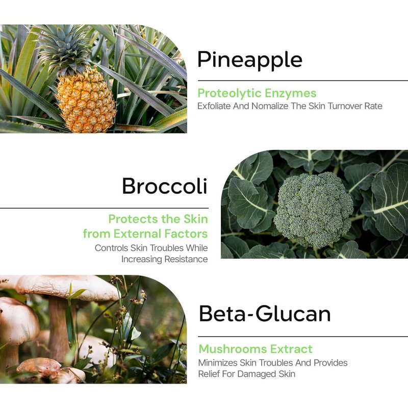 - Clearing Clogged Pores: Pineapple extract gently melts dead skin cells and helps normalize skin turnover rate by rinsing off clogged pores.