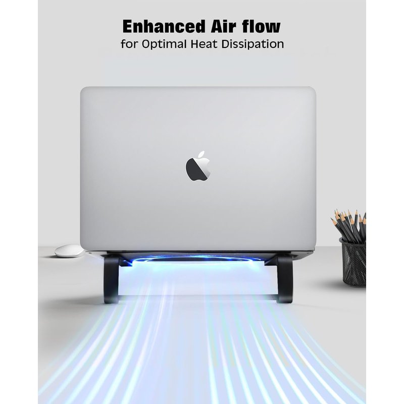 - 3.Rise laptop to comfortable height : Experience ergonomic excellence with our thoughtfully designed laptop ventilation stand. Elevate your laptop to the perfect height and angle for comfortable typing and optimal viewing. Say goodbye to neck and shoulder pain as you work or watch, thanks to our carefully crafted solution. Laptop stand black for macbook air / DJ/Gaming/Work Form Home