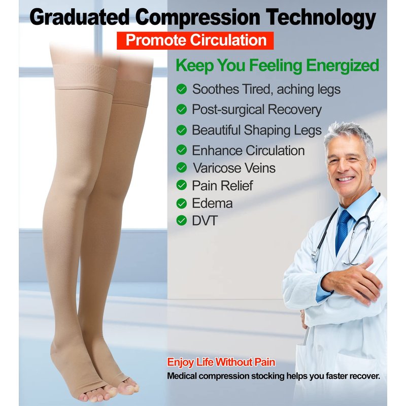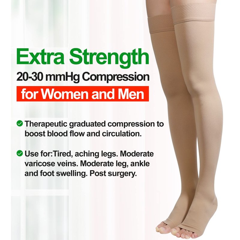MGANG thigh high compression stockings provide firm 20-30mmHg graduated pressure to encourage fluid flow in your circulatory and lymphatic system. These compression stockings offer a classic fit all while providing the benefits of medical-grade compression. MGANG Medical compression stockings help prevent swelling, edema fluid retention, DVT vein clots, pooling of blood, you will notice the change if you wear these a few hours each day. All-day Comfort - These thigh high compression stockings are made with soft spandex yarn which makes them comfortable for all day wear. Dot Top - They have a wide, comfortable silicone top band that stays in place and makes it easy to put on. Knit-In Heel - Defined, Reinforced heel pocket increases durability and sock orientation to achieve ergonomic fit. Comfort Toe - Toeless design for inspection, increased comfort, and sandal footwear. Graduated compression technology is greatest at the ankle and decreases gradually up the leg to promote healthy circulation and keep you feeling energized. Proven Effective: Enhance blood cycling, Relieves varicose veins, Reduce foot swelling, Relieve muscle fatigue and soreness. Prevent edema fluid retention. Post-surgical recovery, and athletic recovery. Pregnant woman, nurses, and doctors, Masseurs, cosmetologists, and stylists. Frequent travelers or anyone taking a long plane flight, Office worker, long time wear high heel shoes persons. Choose the Perfect Fit Compression Stockings for You to Have a Healthy Life!MGANG 20-30 medical compression stockings thigh high compression hose for women men thigh high compression socks women 20-30 mmhg open toe support socks for women compression 20-30 Thigh high leg sleeves Thigh High Compression Sleeves over the knee compression socks for women medias de compresion para varices medias de compresion para mujer compression socks for women 20-30 mmhg knee high medical compression tights medical compression leggings for women men