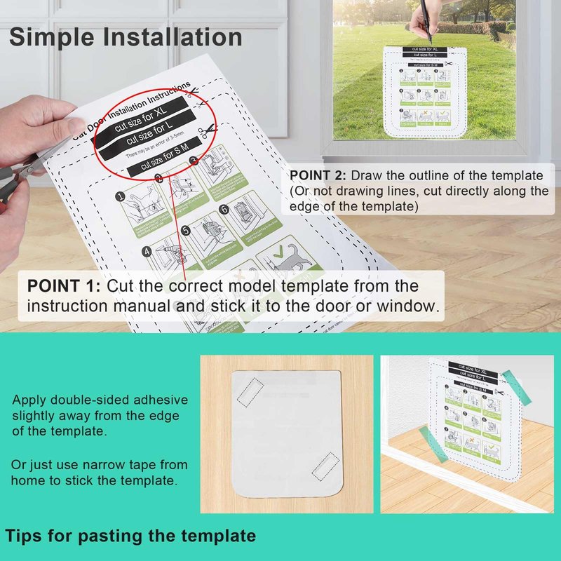 - Simple Installation - Package includes detailed instructions(with templates on), 8 screws and their caps, double-sided tapes. You can cut the template off and install the cat door for sliding glass door easily.