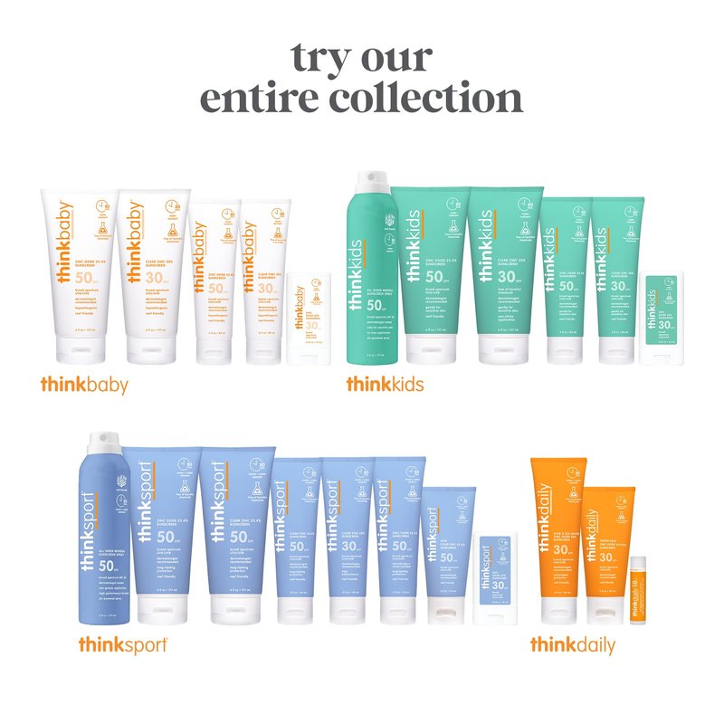 - SUNCARE BY THINK SUN: Thinkdaily, Thinkbaby, Thinkkids & Thinksports have got your family covered with gentle, reef-safe and worry-free ingredient based sunscreens, made to be effective for delicate and sensitive skin without sacrificing protection
