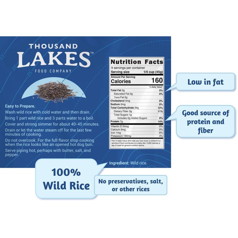 - 100% ALL NATURAL – Thousand Lakes wild rice is harvested in Minnesota and is 100% natural. The only ingredient is wild rice! No preservatives, salt, or other rices added. Wild rice is higher in protein than white rices and grains and is a good source of protein and fiber and low in fat.