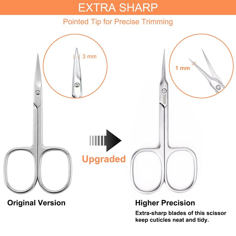 - Precision Grooming Scissors – Crafted with surgical-grade stainless steel these cuticle scissors for nails and hair are 3.5 times stronger than standard small scissors cuticle trimmer to provide stronger, smoother, more precision cuts and trims.