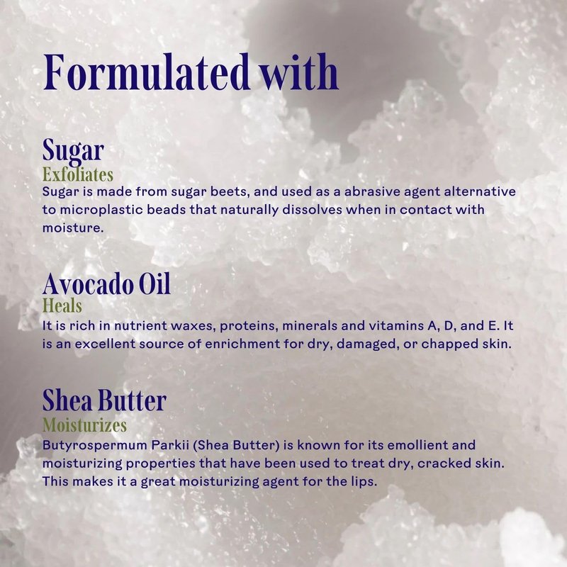 - INTENSIVE LIP MOISTURIZER: After the sugar flakes in this hydrating lip polish have removed dead, peeling skin, Avocado Oil is able to penetrate more deeply, smoothing and replenishing moisture, while Shea Butter is soothing to lips in need of repair.