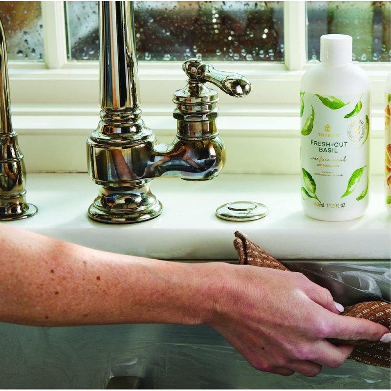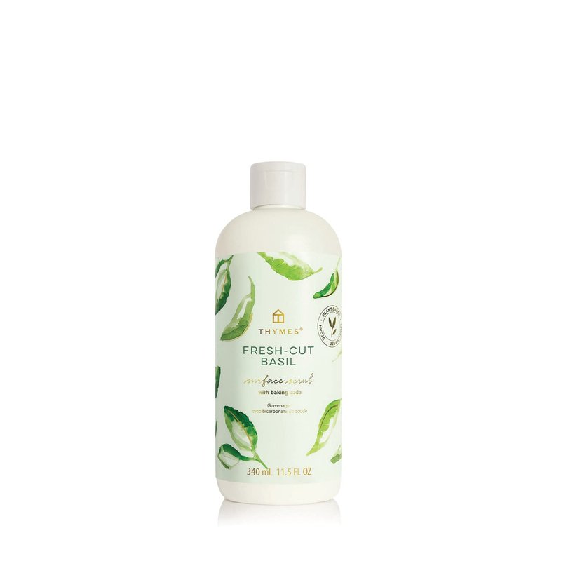 - Fresh-Cut Basil Surface Scrub - Clean and invigorating, the Fresh-Cut Basil fragrances cultivates a backyard herb garden indoors in any season. Gently remove built-up grime and grease with hard-working cleansing agents, baking soda, and extracts of fennel and parsley of Thymes Surface Scrub. For use on surfaces like stovetops, kitchen and bathroom fixtures, pots and pans, stainless steel, ceramic, non-polished countertops, enamel and tile.