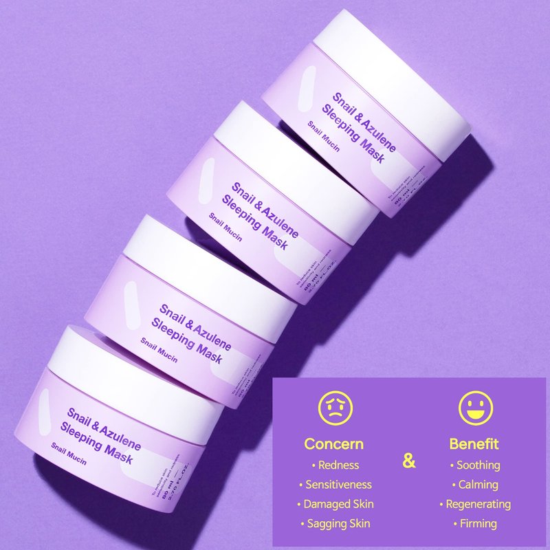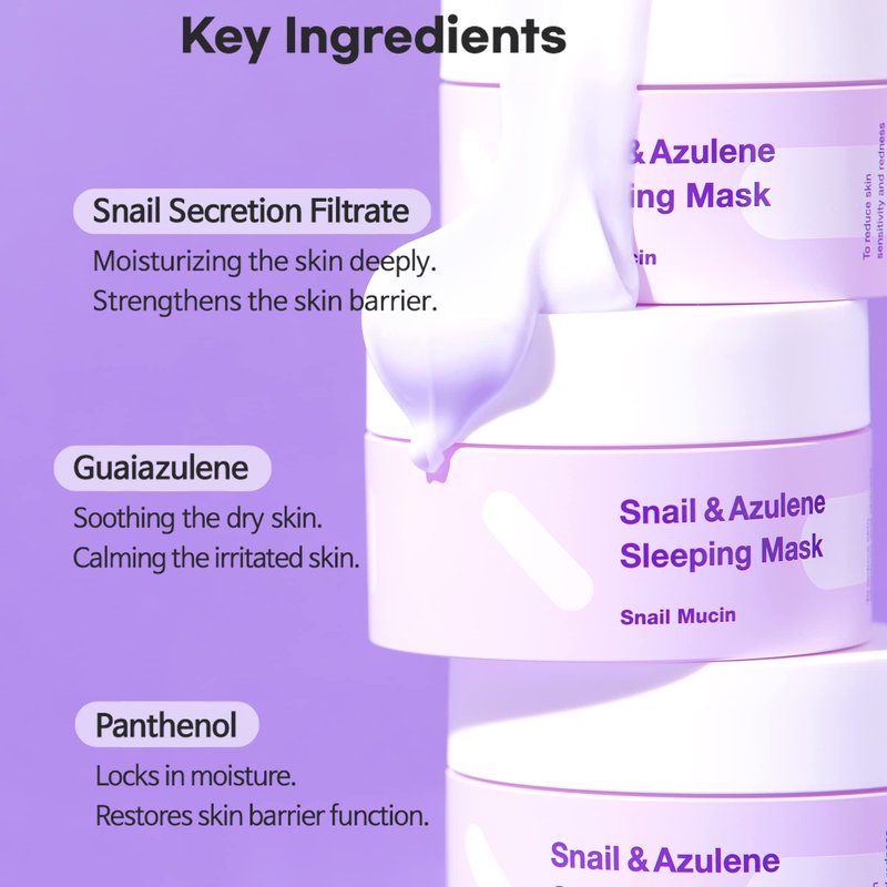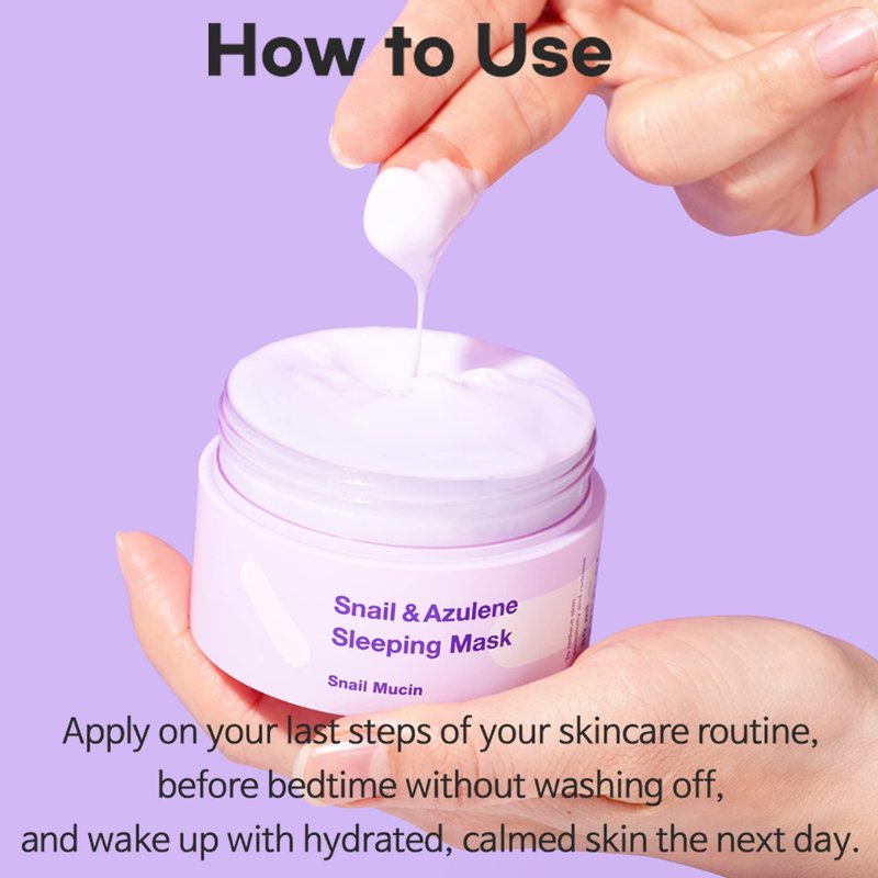 A sleeping mask that Guaiazulene relieves stressed out skin during the day and Snail Secretion Filtrate revitalized your skin over night.