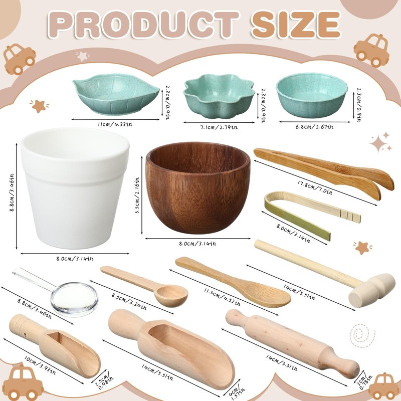 - Material and Size: the size of our sensory bin toy is suitable for boys and girls hands, do not have to worry about it being too large or too small; It is easy to grasp and play, most of the products in the set are made of wood, offering a natural tone and a smooth tactile experience; Magnifying glass and flower pot containers are made of plastic, and there are 3 containers made of wheat straw; All of the materials are reliable, can be applied with confidence, and will not be easily damaged