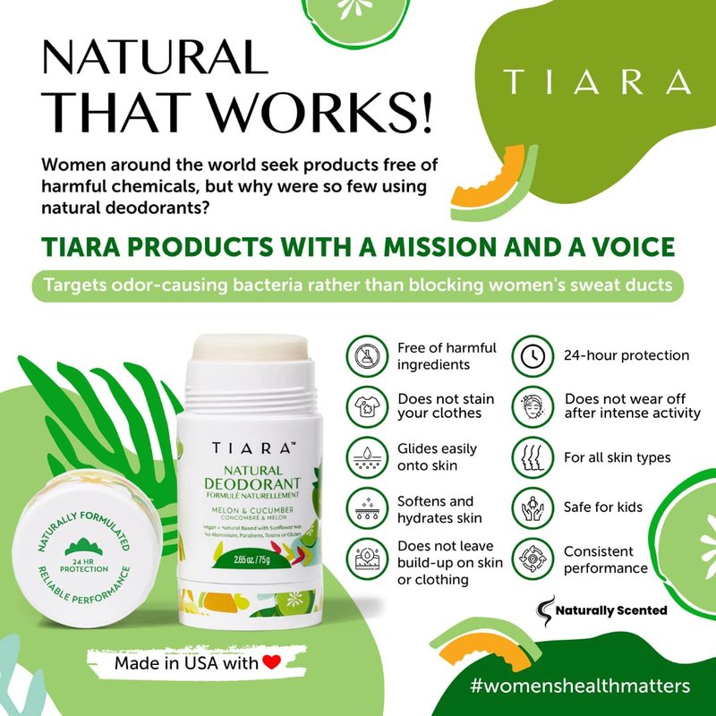 - FRESH SCENT: Enjoy the fresh & clean natural aroma of organic ingredients like coconut, melon, and cucumber that stays with you for 24 hours. With TIARA natural deodorant, you can stay fresh, clean, and confident. Smell natural and improve your hygiene routine with our organic deodorant.