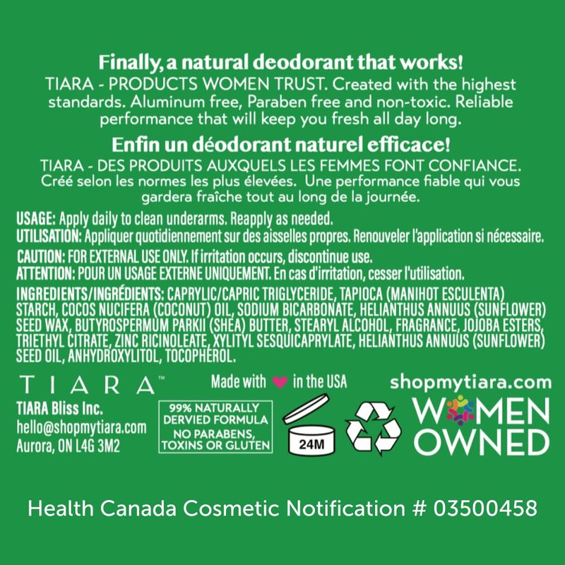 - REGULATES COMFORTABLE FRESHNESS: Crafted with natural ingredients, TIARA natural deodorant prevents unpleasant odors while allowing your body to regulate temperature and moisture. Our deodorant works with your body's natural processes, providing all-day 24 hour freshness without compromising comfort.