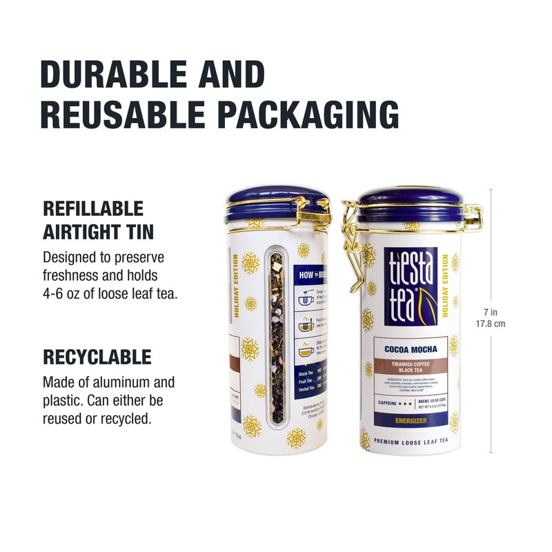 - REUSABLE TEA TIN FOR TEA LOVERS: Our charming and reusable tin is the perfect gift for tea enthusiasts. Offering airtight storage, it ensures that your cocoa mocha loose leaf tea remains cozy and fresh for 40-50 cups. Not only a functional addition to your tea collection, but it also sits beautifully on your countertop, a testament to your passion for fine teas.