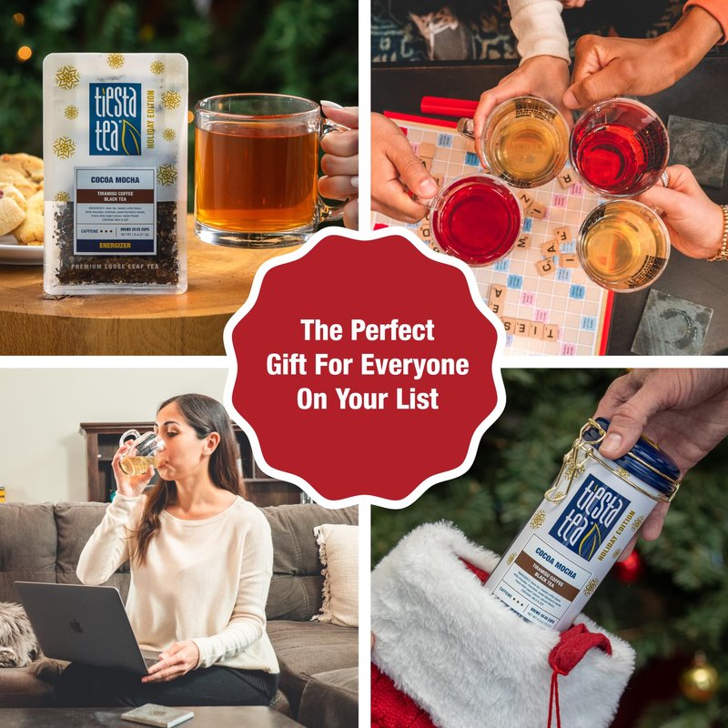 - COCOA MOCHA BLACK TEA: Unleash the tiramisu triple threat in your cup, where black tea, coffee beans, and luxurious chocolate collide. With each sip, elevate your spirits and dive into the festive flavors of the season. This delightful concoction, delightful both plain or sweetened, with milk or a touch of Irish cream, is your ticket to the best time of the year.